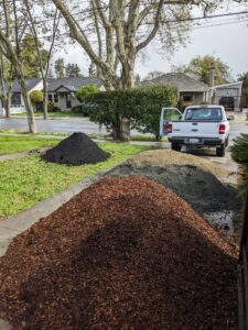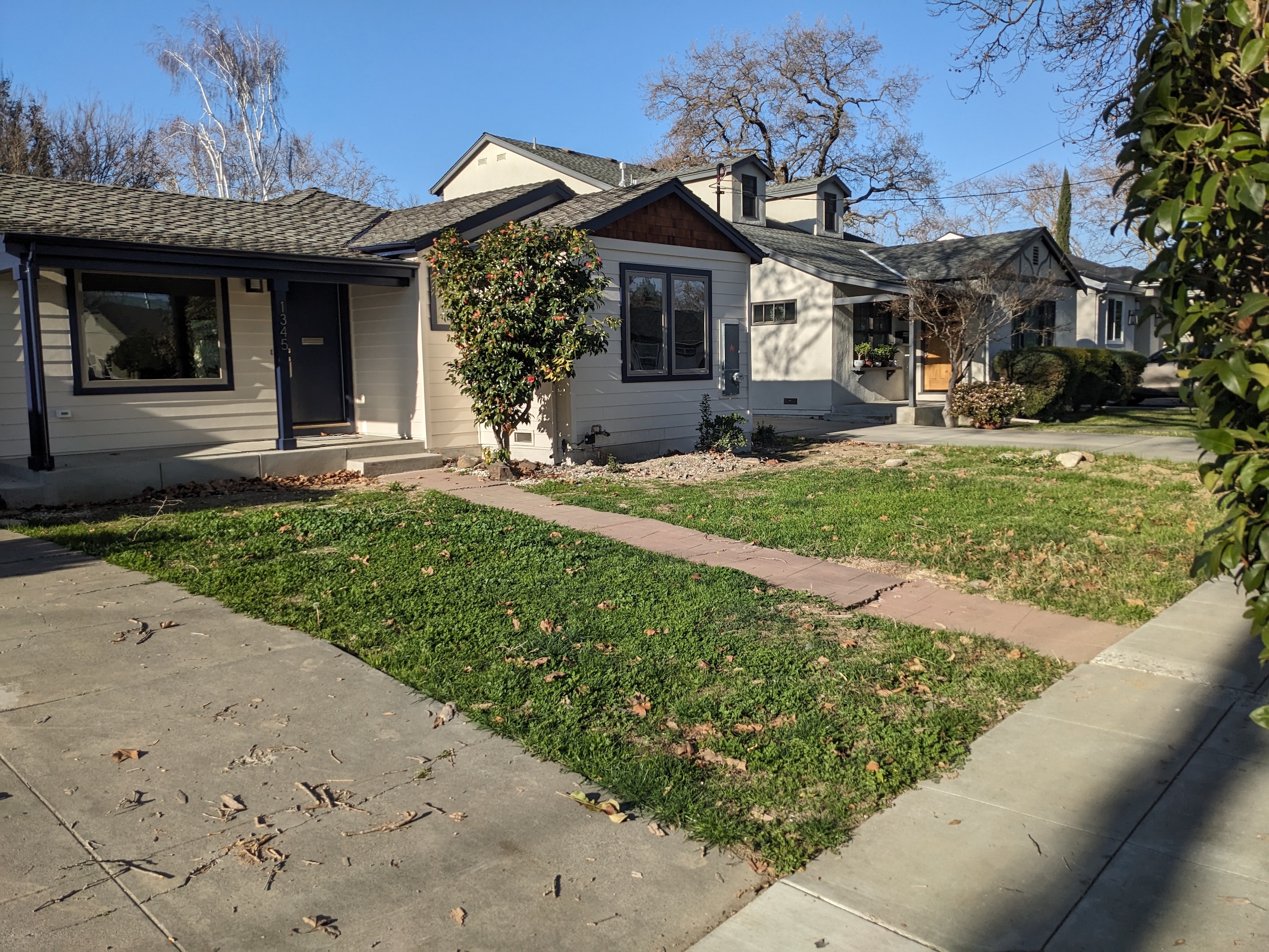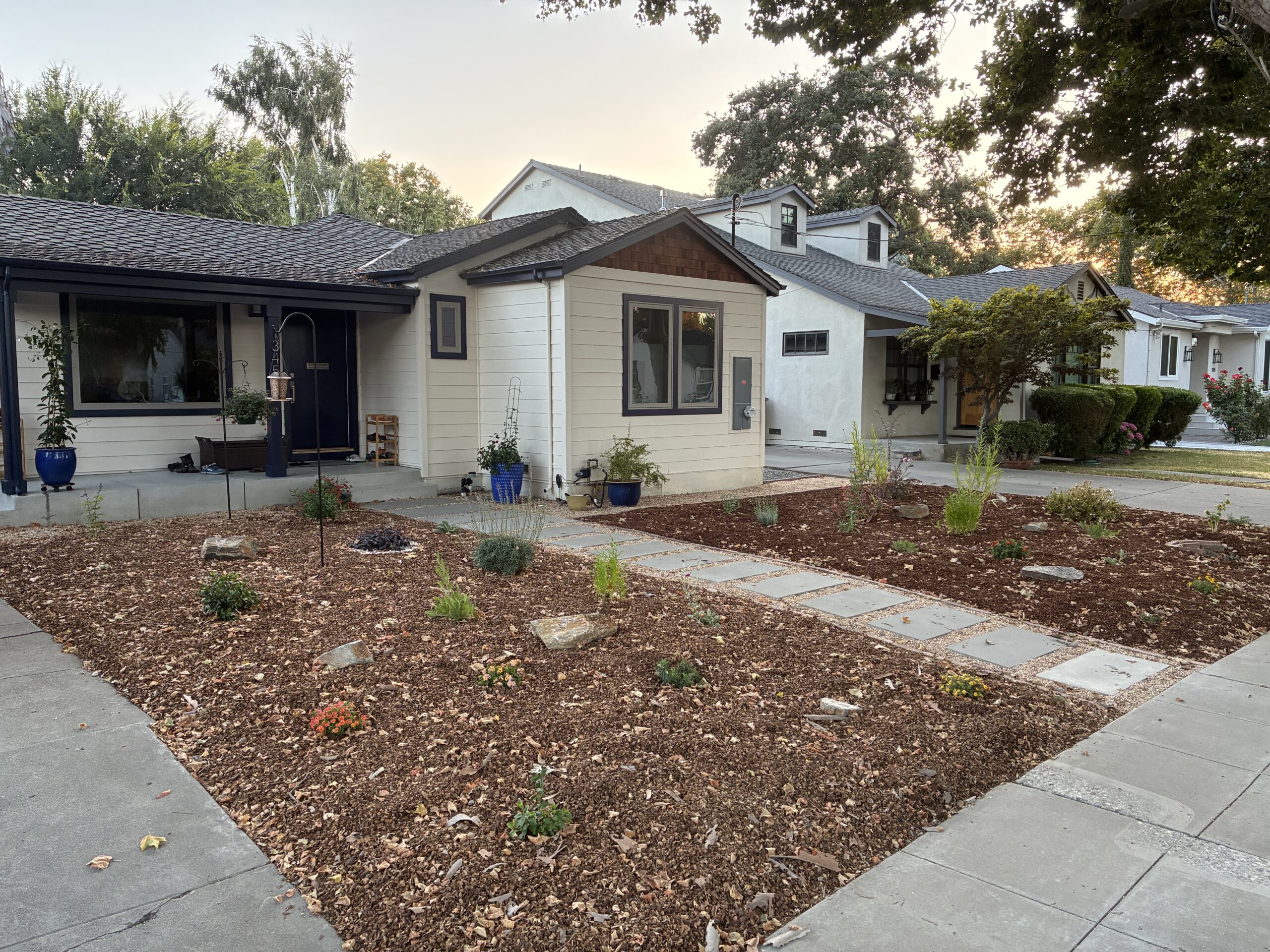 This is a case of sparing no expense, paired with a little bit of resourcefulness. Initially, I started this project remotely (I was still living in Chico and traveling to the area every other weekend before I moved down), and so I had an opportunity to shuttle some mulch and plant materials down and remove some plants and structures before things really got rolling. I staged a few truck beds of almond shell on the driveway, which ended up covering one side of the walkway, and it paired well with the mini fir bark we used to finish the other side. We used large sheets of cardboard (another freebie material) to suppress weeds to great effect; I can still count the number of weeds I’ve pulled since installation on both hands, so the smaller plants will grow into their larger selves for a few growth cycles without competition while the cardboard breaks down. I dug up a bunch of volunteers of various perennials from one of my master gardener clients from Butte county, and we ended up using a lot of those to fill a respectable amount of space. We sourced the brick border for free from the back yard, and rocks for gutter drainage.