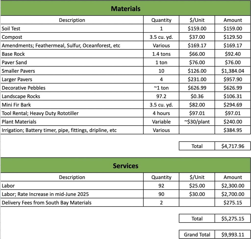 Overall, all of the plants have established themselves since completing this project in July 2025, and the bird feeder and various pollinator friendly species attract plenty of entertainment from the avian locals. So, you can refer to the invoice as a framework for a project. To be sure, a lot of things could be cut down significantly or removed; to do just purely a large garden would be significantly cheaper, as there would be less nuts and bolts of delivering bulk materials and heavy items like pavers.