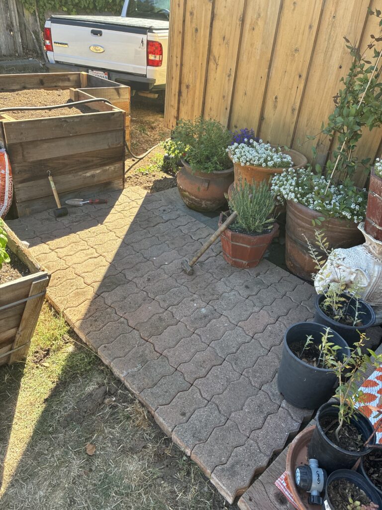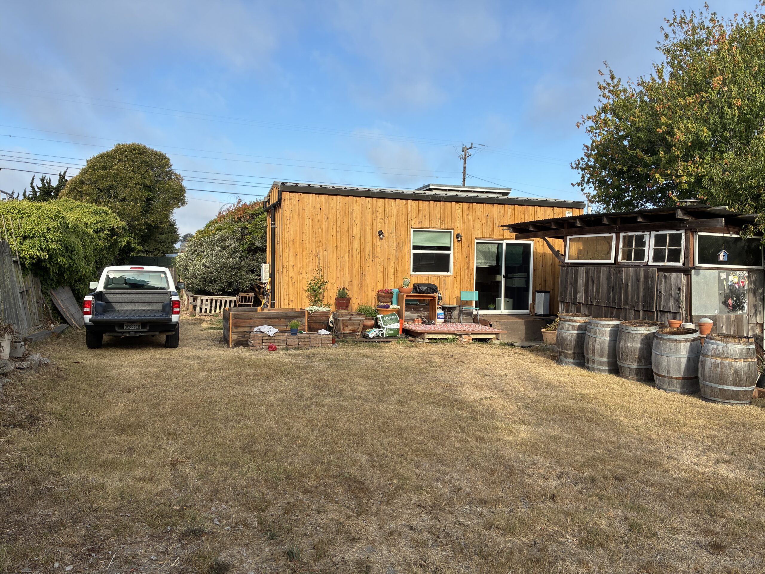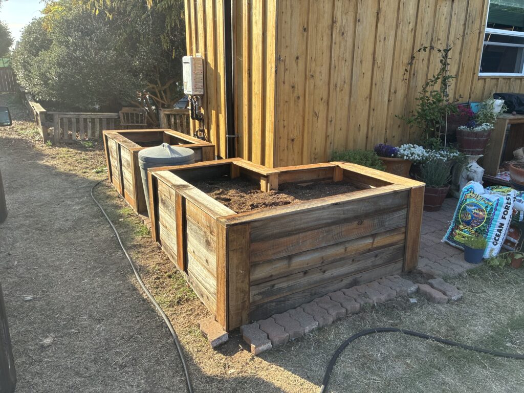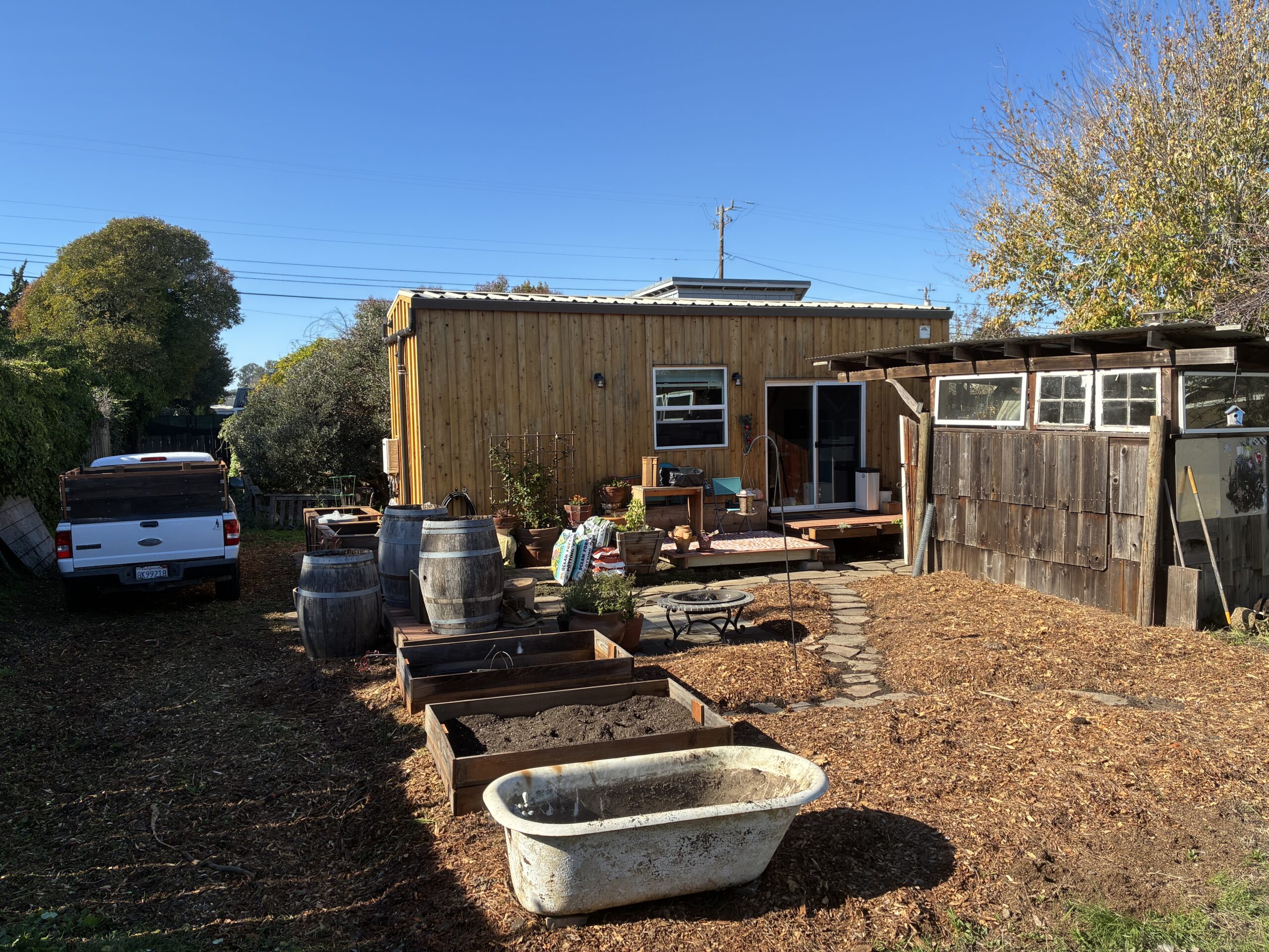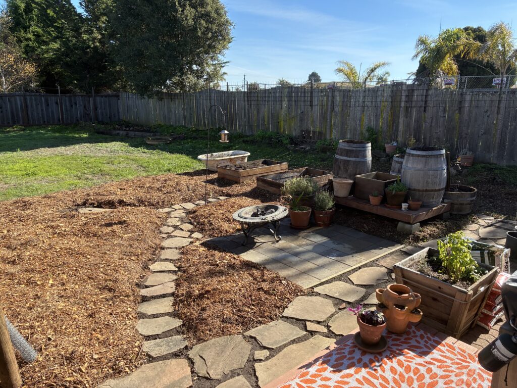 I moved from Chico into a tiny house in the middle of Santa Cruz, but lo and behold what I *actually* moved into was a permaculture wet dream. I quickly assessed the situation, and came to the fast conclusion that I had a blank canvas with a huge array of materials on site; lumber, composite decking, flagstone, masonry, and some interesting odds and ends such as a clawfoot bathtub and a giant bird bath. I also acquired several wine barrels for free, along with some other random items. So, while reading Gaia’s Garden, the permaculture bible, I set to work putting all of this free material together…